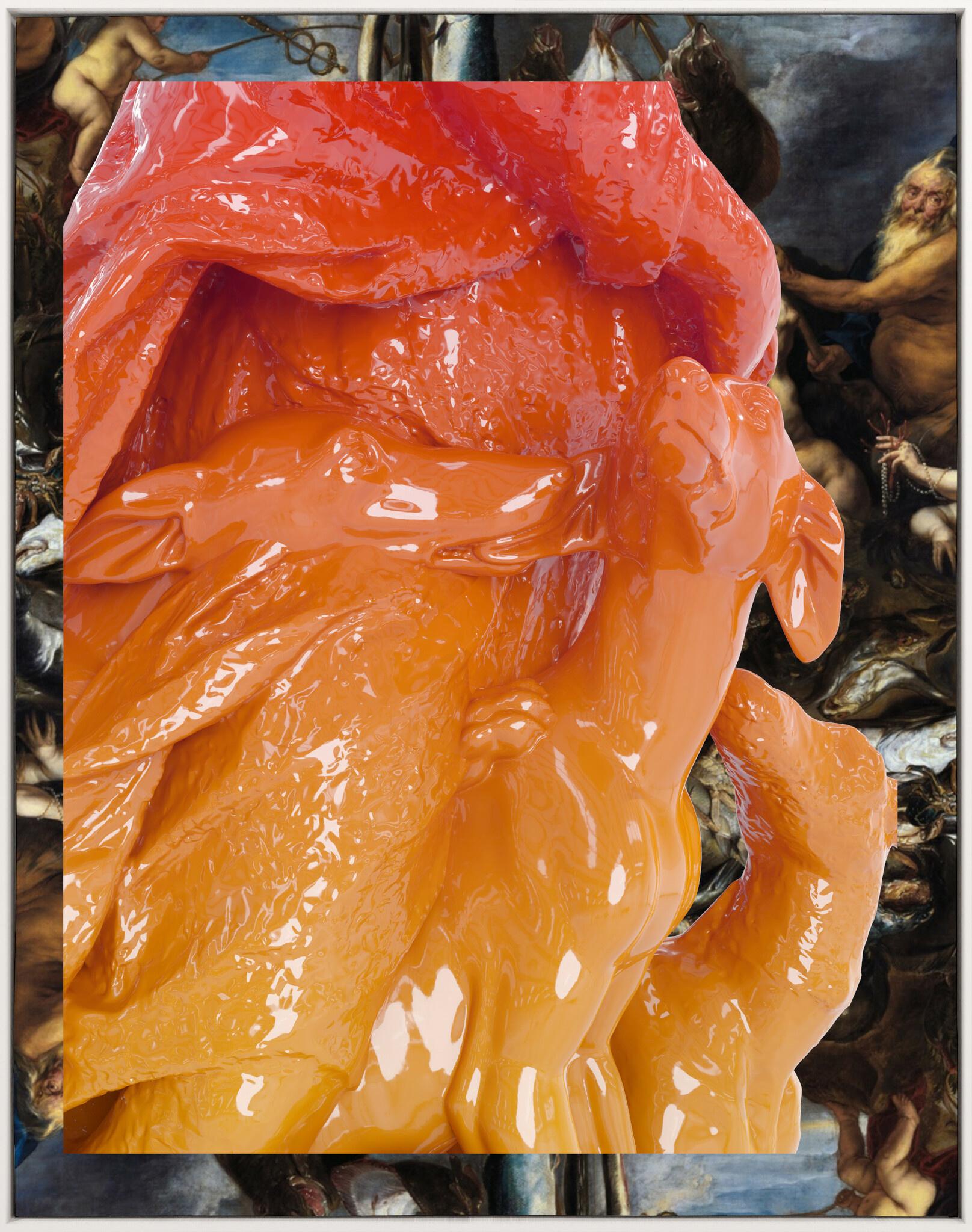 übermalter Inkjetdruck auf Leinwand auf rückseitig bedrucktem Aluminium., Acrylglas