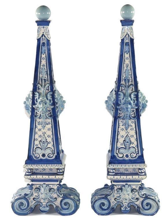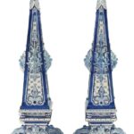 Diese hier nun ausgestellten Miniaturobelisken aus Keramik sind wahre Schmuckstücke, in filigraner Blau-Weiß-Malerei und reichlich verziert mit einem umlaufenden Dekor aus Akanthusblatt und weiteren Ornamenten sowie je vier Maskarons (groteske Maskenköpfe) an den Schauseiten. Der Maskaron ist als Element der Karikatur seit der Antike bekannt, ebenso wie die Obelisken selbst. Im niederländischen Delft wurden diese dekorativen Prestigeobjekte im 18. Jahrhundert gefertigt. Gegründet wurde die Delfter Fayence-Manufaktur aufgrund der sehr hohen Nachfrage chinesischen Porzellans im 17. Jahrhundert. Die Idee war, das Porzellan zu Imitieren und so entstand die zinnlasierte Keramik, das bis heute populärste niederländische Nationalprodukt.