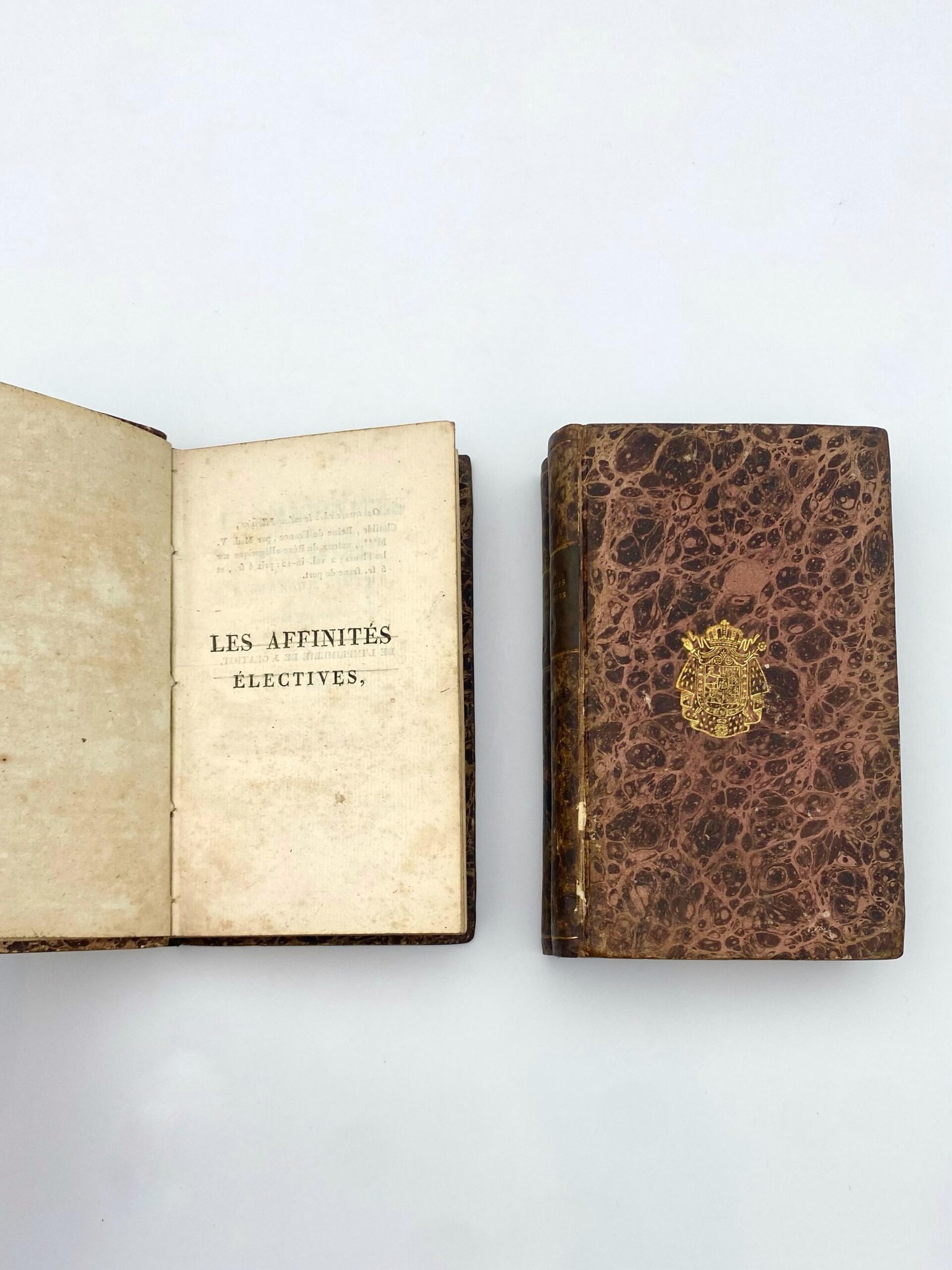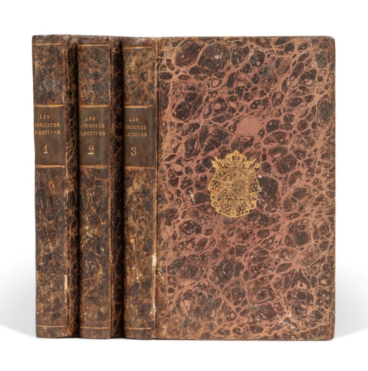 Die erste französische Ausgabe der Wahlverwandtschaften; nur ein Jahr nach der Erstausgabe, die 1809 in Tübingen bei Cotta erschien, mit berühmter Provenienz: Die Bände stammen aus der Bibliothek des französischen Geschäftsmannes, Mäzens und Lebenspartners des Modeschöpfers Yves Saint Laurent, Pierre Bergé. Gemeinsam haben sie das Modehaus YSL aufgebaut und eine der größten Kunstsammlungen Europas zusammengetragen. Erstbesitzer war wiewohl Jérome Bonaparte, der jüngste Bruder Napoleons. Zum Zeitpunkt der Veröffentlichung der Wahlverwandtschaften amtierte er unter dem Namen Jérome-Napoleon I als König von Westphalen. Von den Bürgern wurde er „König Lustig“ genannt, da sich seine Kenntnisse der deutschen Sprache in einem Satz erschöpft haben sollen: „Morgen wieder lustig!“