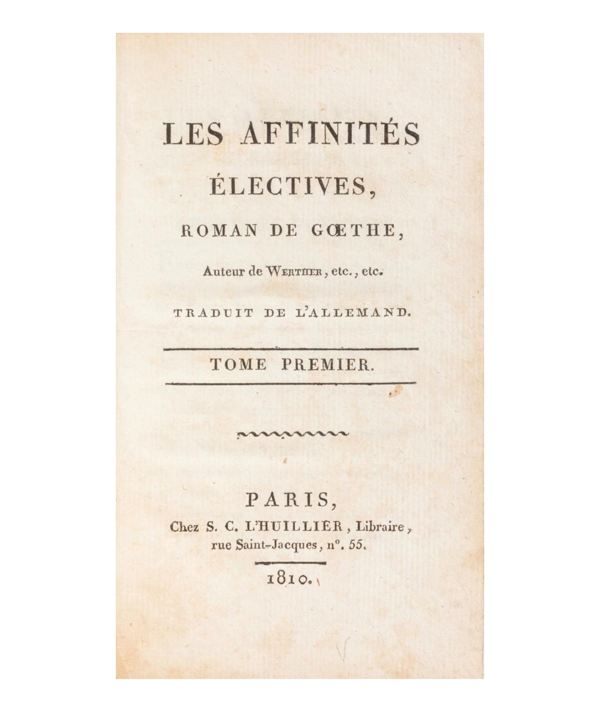 Les Affinités électives, Roman de Goethe, Auteur de Werther, etc., etc. Traduit de l´allemand. Paris, S.C. Huillier. 1810.